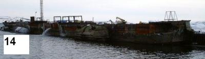 Фото 14. Большой противолодочный корабль пр. 1155 «Удалой». Все что осталось. В 2002 году частично разобран, после чего затонул в акватории поселка Белокаменка в Кольском заливе. В марте 2006 утилизирован.