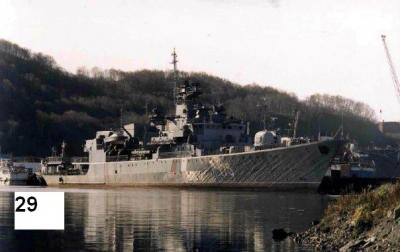 Фото 29. Пограничный сторожевой корабль пр. 11351 «Псков». «Псков» на частичном демонтаже в бухте Бабья, 26 октября 2002 года. 28 февраля 2003 года корабль уведен с Камчатки для разделки в Китай.