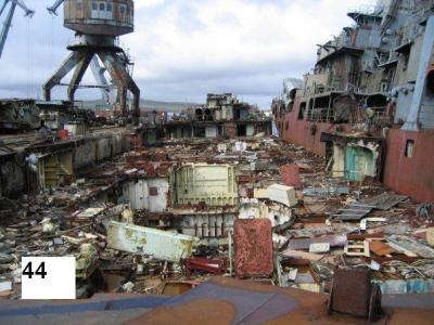 Фото 44. Груда мусора – когда-то до Путина: трудно узнаваемый эскадренный миноносец «Отчаянный». Утилизирован в 2003 году. Рядом такой же собрат по несчастью …..