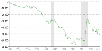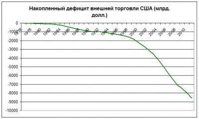 За период с начала 1970г. по 2008г ежегодный дефицит внешней торговли США подскочил с $15 млрд. до $551 млрд. - т.е. в 36,7 раз. При этом на протяжении последних лет (2000-2011гг.) США импорт товаров и услуг превышал объёмы экспорта на $350-600 млрд. или 3,5-5% ВВП.