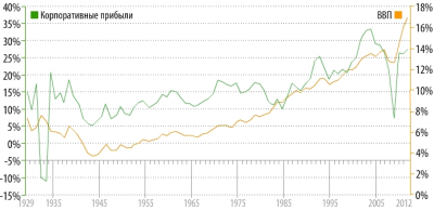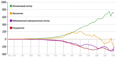 Закономерным итогом развязывания рук финансовой олигархии, контролирующей печатный станок Федерального резерва, стало масштабное перераспределение активов и национального дохода в интересах узкой группы лиц, монополизировавших большую частью финансовой системы и установивших контроль над ключевым эмиссионным центром мировой экономики - ФРС США. В результате этого удельный вес финансового сектора в корпоративных прибылях США подскочил с 4% в 1947г. до 45% в 2007г., а доля в ВВП страны расширилась с 2% до 17%. В действительности, принимая во внимание масштабы перераспределения активов и национального богатства в пользу финансовой олигархии, а также контроль над критически значимой частью финансовых активов государства, населения и корпоративного сектора, речь может идти о доминирующем положении крупного транснационального финансового капитала в экономике и политике США – до 30% в ВВП и 50% в прибылях.