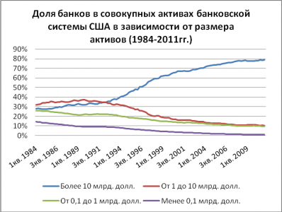 Рис.3 Доля банков в совокупных активах банковской системы США в зависимости от размера активов