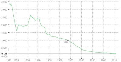 Рис.7 Покупательная способность американского доллара (1967г. = $1)