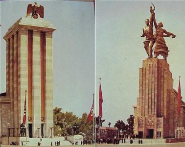 Демонстрацией успехов СССР в 1937 году явился павильон Советской страны на Всемирной выставке в Париже. Фигуры Рабочего и Колхозницы, созданные В. И. Мухиной, символизировали мощь и динамизм молодой Страны Советов. Так получилось, что германский павильон оказался расположен напротив советского павильона. Архитектору германского павильона будущему министру вооружений Альберту Шпееру удалось узнать хранившийся в тайне эскиз советского павильона. Шпеер вспоминал: "Скульптурная пара высотой в десять метров победоносно двигалась по направлению к германскому павильону. Поэтому я создал эскиз кубической массы, которая была поднята на мощные опоры. Казалось, что эта масса останавливает наступление фигур. В то же время на карнизе башни я поставил орла, который держал в когтях свастику. Орел сверху вниз смотрел на русскую скульптуру. Я получил золотую медаль выставки за павильон". Но Шпеер признавал, что "такой же награды удостоились и советские коллеги".