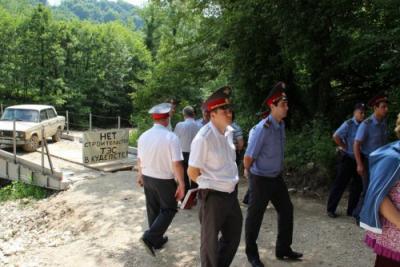 После обеда на место блокады прибыли начальник милиции общественной безопасности Отдела МВД РФ по Хостинскому району г.Сочи и около 40 сотрудников полиции. Ситуация накалялась. Один из представителей компании-застройщика по фамилии Сураев вел себя крайне агрессивно. При этом на вопросы возмущенных жителей о том, почему незаконное строительство продолжается, никто из представителей компании ничего вразумительного ответить не мог, так же как не мог и предоставить жителям и представителям полиции разрешительную документацию. Один из полицейских заявил, что машина на мосту заминирована, и протестующих оттеснили от переправы к лесу, а машину откатили в сторону. При этом силовики давали понять жителям, что их собрание – "несанкционированный митинг", и намекали на то, что к ним могут быть применены соответствующие меры. Переговоры между жителями и представителями правоохранительных органов вели помощник депутата Госдумы Сергея Обухова Игорь Васильев и член Совета Экологической Вахты по Северному Кавказу Владимир Кимаев.