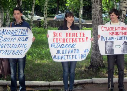 Из окна министерства наблюдал за пикетом зам. министра образования Гуляев. Участники обратили внимание, что он нервничал и кому-то постоянно дозванивался. Через 10 минут после этого к активисту ЛКСМ Павлу Барабанщикову подошли представитель администрации Ленинского района и сотрудник полиции. Им не понравился легальный плакат, на котором было написано: «Студентам – квартиры, Путину – сортиры!». «Это не по теме мероприятия… сверните его», – негодовали власть имущие.