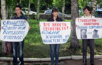 Активисты с красными флагами выстроились перед окнами министерства и держали в руках плакаты: «Вся власть студсовету! Долой жуликов из министерства!», «Министры! Дайте нам бесплатно учиться!», «Закон №83 – смертный приговор общественному образованию», «Студентам – квартиры, Путину – сортиры!».