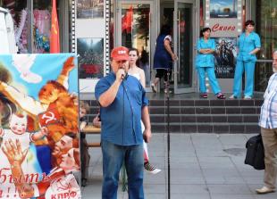 Около кинотеатра "Пионер" активисты КПРФ и их сторонники развернули красные флаги и транспаранты с красноречивыми надписями: «Будущее для детей – социализм!», «Защитим детей – спасем детей – спасем Россию!», «Капитализм – убийца наших детей!», «Советское детство – счастливое детство!», «Правительство олигархов в отставку!», «В очереди в саратовский детсад состаришься!». Также коммунисты раздавали агитационную литературу.