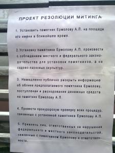 Также митингующие потребовали немедленно раскрыть информацию об облике предполагаемого памятника Ермолову, поступлении и расходовании денежных средств на возведение монумента, а также провести прокурорскую проверку всех процедур, связанных с установкой памятника и привлечь виновных лиц к ответственности за нарушения федерального и местного законодательства.