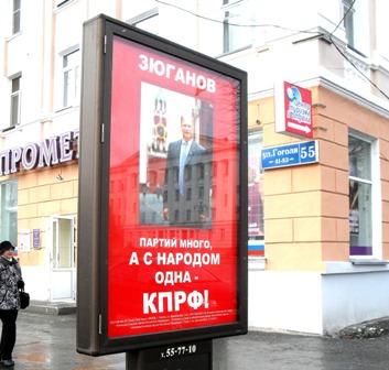 С конца октября по всему Кургану появилась агитация коммунистов: портреты Зюганова, призывы, изображения кандидатов в депутаты Государственной Думы ФС РФ по Курганской региональной группе КПРФ, доверенных лиц партии. Лейтмотив - один: "Партий много, а с народом одна - КПРФ!".