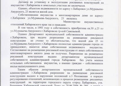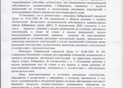 И далее прокуратура заключает: «Таким образом, департаментом муниципальной собственности администрации г. Хабаровска разрешение на размещение («ранее», ремарка автора) рекламной конструкции («смонтированной ранее», ремарка автора) выдано в нарушение положений п.3 Положения о порядке регулирования отношений, возникающих в процессе размещения рекламных конструкций на территории городского округа «Город Хабаровск», утвержденном решением Хабаровской городской Думы от 20.06.2006 г. №280, а также в нарушение п.5 ст.19 Федерального закона «О рекламе» от 13.05.2006 г. №38-ФЗ».
