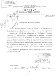 Прошу дать протокольное поручение Комитету по безопасности и противодействию коррупции и Комитету по конституционному законодательству и государственному строительству запросить информацию в Правительстве Российской Федерации о возможности внесения изменений в постановление Правительства Российской Федерации от 1 декабря2006 г. N 737 «О специальных световых и звуковых сигналах» с целью сокращения перечня государственных органов, на транспортные средства которых устанавливаются устройства для подачи специальных звуковых и световых сигналов при отсутствии специальных цветографических схем на наружной поверхности этих транспортных средств, и количества транспортных средств, оборудуемых устройствами для подачи специальных сигналов.