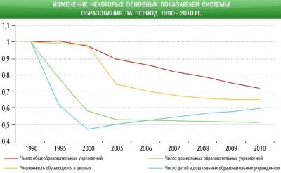 Рис.4 Изменение ряда основных показателей системы образования в России за период 1990-2010гг. (1990г. = 1)