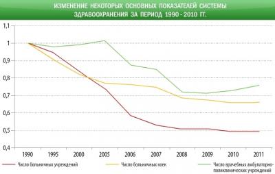 Рис.2 Изменение ряда основных показателей системы здравоохранения в России за период 1990-2010гг. (1990г. = 1)
