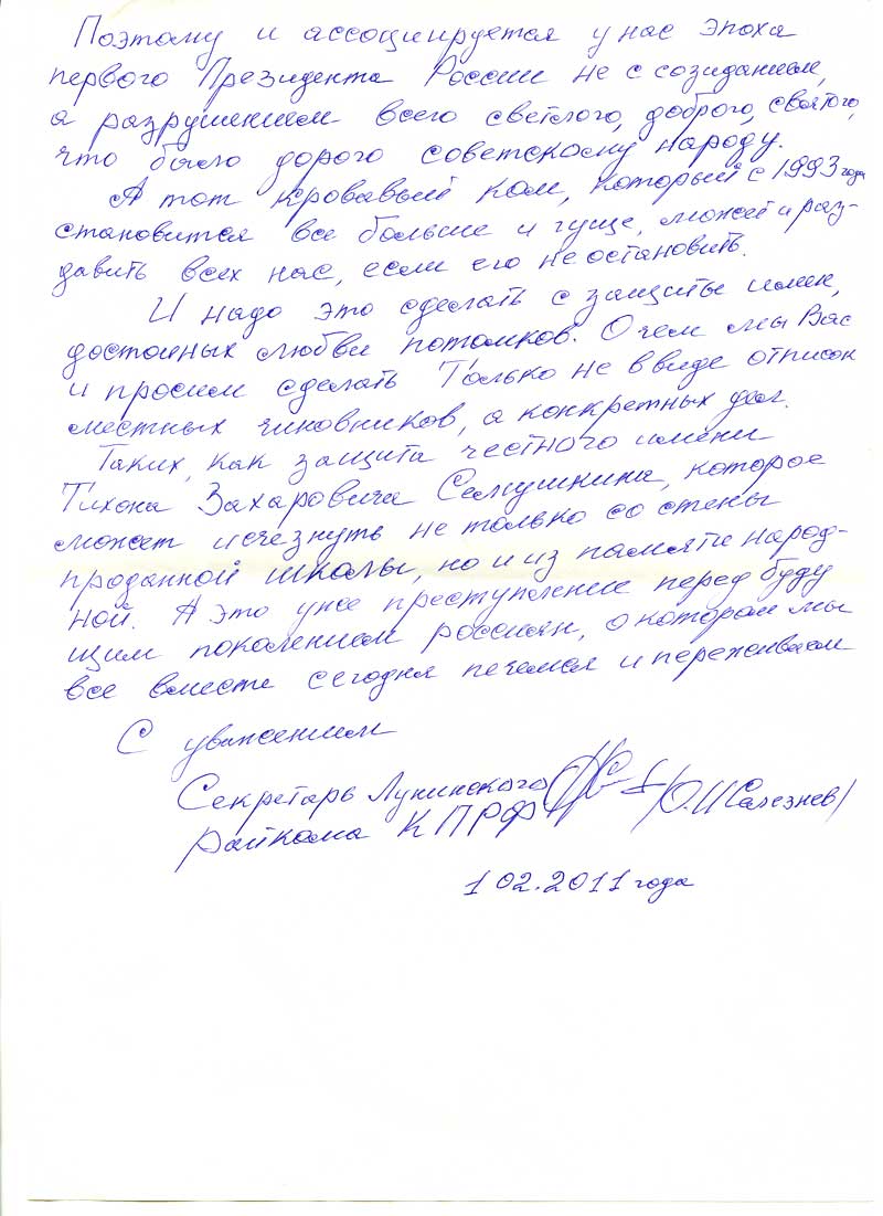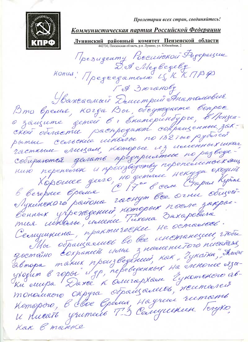 Между тем, коммунисты Лунинского района решили обратиться к президенту Медведеву и рассказать о произошедшем в селе Старая Кутля. Ниже публикуем текст этого обращения.
