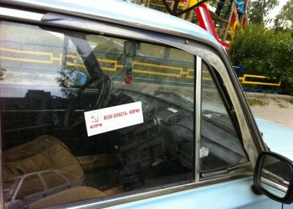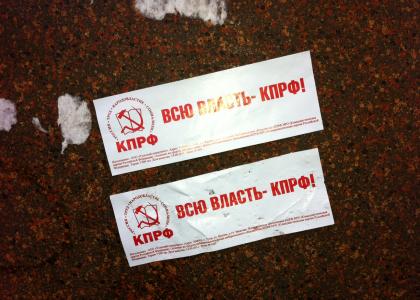 Неизвестные молодые люди расклеили по всему городу плакаты «Вся власть КПРФ». Причем наклейки появились не только на стенах домов, но и на дверях подъездов, стеклах автомобилей. На плакатах указывалось, что данная продукция выпущена якобы по заказу КПРФ.
