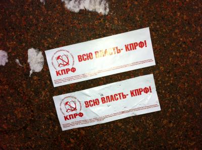 Неизвестные молодые люди расклеили по всему городу плакаты «Вся власть КПРФ». Причем наклейки появились не только на стенах домов, но и на дверях подъездов, стеклах автомобилей. На плакатах указывалось, что данная продукция выпущена якобы по заказу КПРФ.