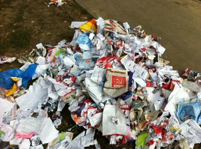 Куча эта появилась перед зданием Выксунского горкома КПРФ. По мнению наблюдателей, ее появление может быть связано с деятельностью «Молодой гвардии «Единой России». Состоит куча из обрывков агитационной продукции коммунистов, которая ранее была сорвана с агитационных стендов и похищена из почтовых ящиков. Видимо, таким способом «медвежата» в бессильной злобе решили отомстить КПРФ, одержавшей победу на выборах. Впрочем, ничего удивительного. Что еще ждать от «молодой гвардии» партии жуликов и воров, кроме политического хамства?