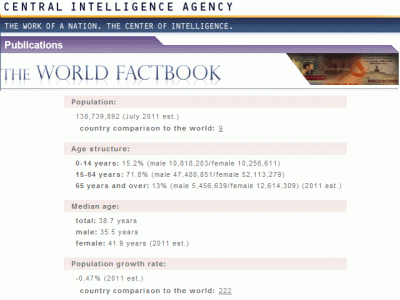 Американская разведка опровергает Росстат: темп сокращения российского населения почти в 15 раз выше, чем указано в официальных сводках этой федеральной службы. Не верят в ЦРУ и оптимистичным оценкам роста продолжительность жизни в России, а также данным статистики по смертности и рождаемости, заметила "Независимая газета". Что интересно, собственные данные, неизвестно откуда, впрочем, взятые, ЦРУ открыто публикует на своем сайте - не только по России, но и по остальным странам.