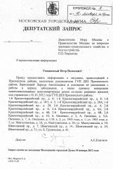 В этой связи 18 января на заседании Мосгордумы руководитель фракции КПРФ Андрей Клычков озвучил запрос на имя заместителя Мэра Москвы по вопросам ЖКХ Петра Бирюкова, в котором попросил предоставить информацию о ситуации в Пресненском районе, в частности, основаниях увольнения руководителя ГУП ДЕЗ Ларисы Ларионовой и причин не передачи 24 многоквартирных домов в управление ГУП ДЕЗа.