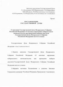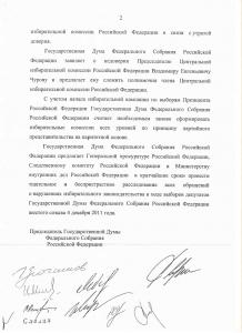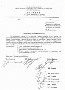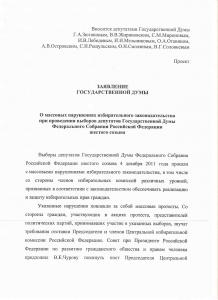Депутаты Госдумы Г.А. Зюганов, В.В. Жириновский, С.М. Миронов, И.В. Лебедев, И.И. Мельников, О.А. Оганян, А.В. Островский. С.Н. Решульский, О.Н. Смолин, В.Г. Соловьев внесли на рассмотрение Госдумы проект заявления Государственной Думы о массовых нарушениях избирательного законодательства при проведении выборов депутатов Государственной Думы Федерального Собрания Российской Федерации шестого созыва.