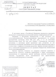 Государственная Дума отказалась поддержать протокольное поручение, внесенное 8 февраля депутатами-коммунистами А.А. Ющенко, А.Д. Тычининым, Ю.В. Афониным, С.П. Обуховым, и касающееся ситуации в сельском хозяйстве Башкирии.