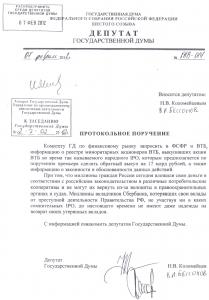 Комитету ГД по финансовому рынку запросить в ФСФР и ВТБ, информацию о реестре миноритарных акционеров ВТБ, выкупивших акции ВТБ во время так называемого народного IPO, которым предполагается по поручению премьера сделать обратный выкуп на 17 млрд рублей, а также информацию о законности и обоснованности данных действий.
