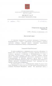 Депутаты Госдумы фракции КПРФ В.Ф. Рашкин, С.П. Обухов и В.П. Пешков, фракции ЛДПР Я.Е. Нилов, А.Н. Диденко, А.Н. Свинцов, А.В. Островский направили депутатские запросы генеральному прокурору Ю.Я. Чайке и председателю ЦИК В.Е.Чурову.