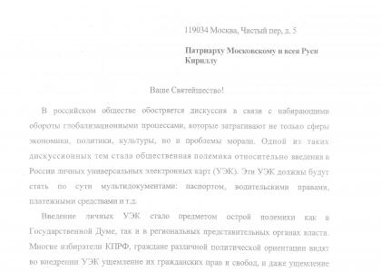 Наши избиратели, как воцерковленные, так и считающие себя носителями православной культурной традиции, поручили руководству фракции КПРФ обратиться к Вам, Ваше Святейшество, с просьбой разъяснить: «Является ли духовно опасным и допустимо ли для православных христиан принятие универсальных электронных карт? Да или нет?»