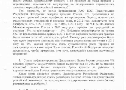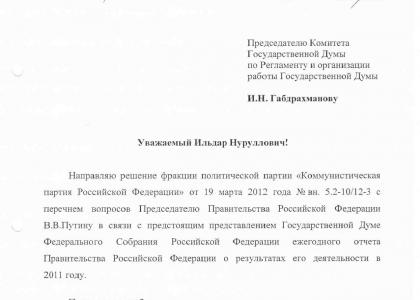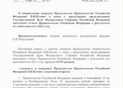 Рассмотрев вопрос о перечне вопросов Председателю Правительства Российской Федерации В.В.Путину в связи с предстоящим представлением Государственной Думе Федерального Собрания Российской Федерации ежегодного отчета Правительства Российской Федерации о результатах его деятельности в 2011 году, фракция КПРФ решила: