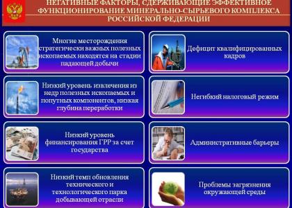 Добыча минерального сырья остается основой российской экономики. Экспорт сырой нефти, нефтепродуктов, природного газа, угля, руд и концентратов как и ранее обеспечивает более двух третей валютных поступлений в страну, а если учесть металлы, экспортируемые большей частью в необработанном виде, минеральные удобрения и продукцию неорганической химии, а также драгоценные металлы и камни, то доля продукции минерально-сырьевого комплекса в экспорте достигает 80%.