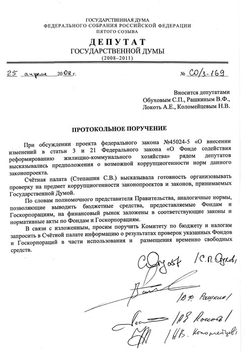 На пленарном заседании Государственной Думы 25 апреля депутатами фракции КПРФ С.П. Обуховым, В.Ф. Рашкиным, А.Е. Локотем, Н.В. Коломейцевым внесено протокольное поручение о проверке на коррупциогенность закона о Фонде содействия реформированию жилищно-коммунального хозяйства.