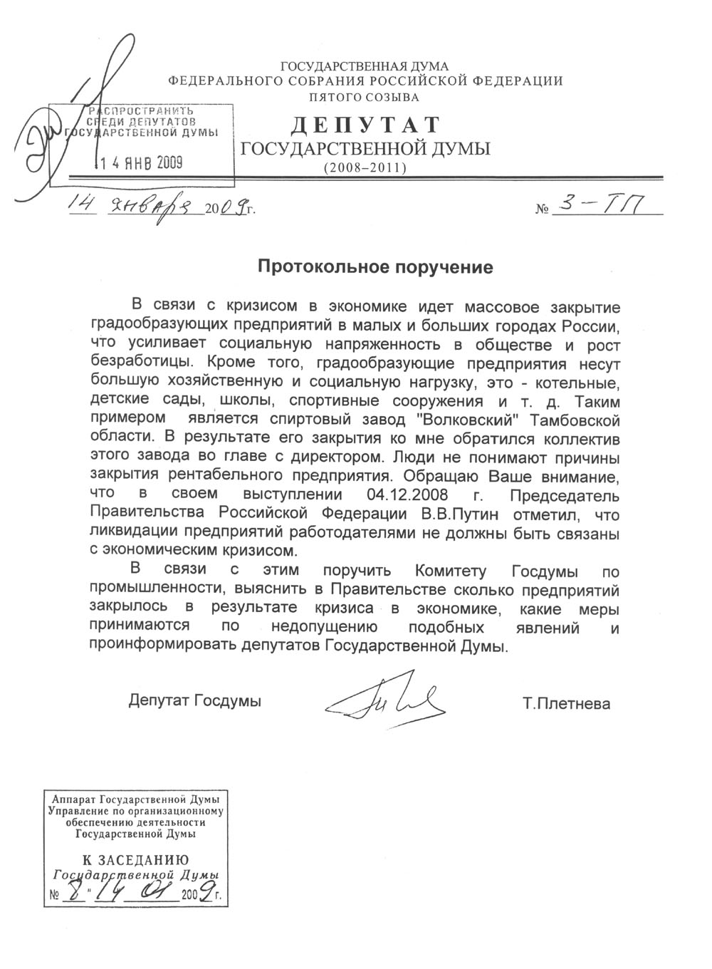 14 января на пленарном заседании Государственной Думы депутат-коммунист Т.В. Плетнева обратилась с протокольным поручением Комитету по промышленности в связи с закрытием градообразующих предприятий.
