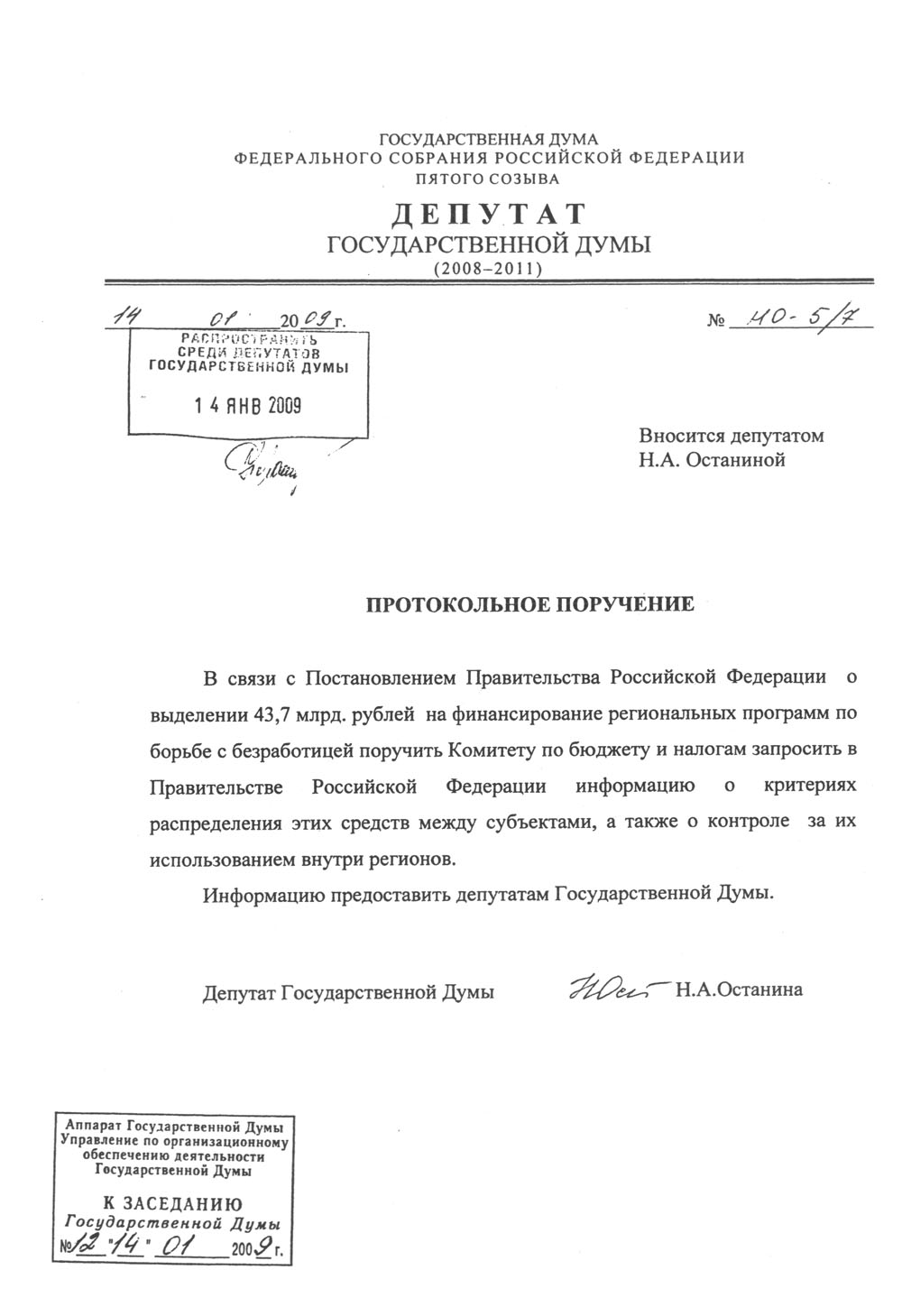 В ходе заседания Госдумы 14 января депутат-коммунист Н.А. Останина поставила вопрос о необходимости контроля за распределением средств, выделенных на финансирование региональных программ по борьбе с безработицей.