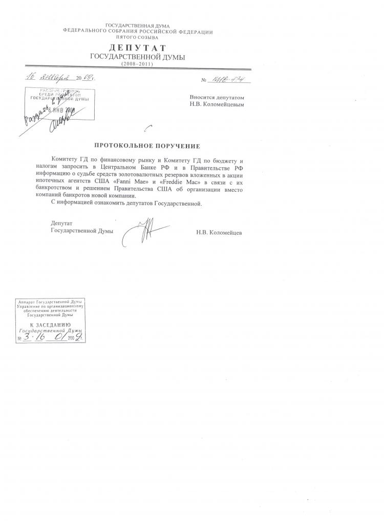 Комитету ГД по финансовому рынку и Комитету ГД по бюджету и налогам запросить в Центральном Банке РФ и в Правительстве РФ информацию о судьбе средств золотовалютных резервов вложенных в акции ипотечных агентств США "Fanni Mae" и "Freddie Mac" в связи с их банкротством и решением Правительства США об организации вместо компаний-банкротов новой компании.