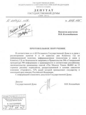 И второе. Прошу дать протокольное поручение о правомерности распространения газеты "Московские новости" в салонах самолетов авиакомпании "Аэрофлот", 52% акций которой принадлежит государству.