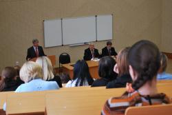 Дальше ждал город Владимир. Заехав по пути на заседание Молодежного парламента Владимирской области, депутаты фракции взяли курс на Владимирский государственный гуманитарный университет. Только-только университет вдохнул воздуха. Он прошел аккредитацию. То есть не попал в ликвидационный список министра Андрея Фурсенко, решившего, что вузов в стране многовато и их надо сократить до двухсот пятидесяти. И хотя в образовательном сообществе, в кулуарах учебных заведений, не иначе как маразмом это не называют, с трибуны об этом открыто говорят только депутаты-коммунисты. С трибуны ВГГУ Иван Мельников тоже озвучил эту тему: «Очень просто понять ситуацию, если даже сопоставить цифры. То количество вузов, которое предлагает оставить господин Фурсенко, это примерно то самое количество, которое было в дореволюционной России. Только тогда у нас было население 91 миллион человек. И больше половины населения было безграмотным. Сегодня у нас 54% выпускников школ – учатся в вузах. Много это или мало? Давайте сравним, это хороший метод. В Скандинавии около 80%, в высокоразвитых странах, Германии, Японии, - более 80%. Даже в Прибалтике больше 70%. Так вот я хочу чтобы вы задали себе вопрос: куда и в какую сторону ведет высшую школу Фурсенко и известная партия, которая поддерживает в Государственной Думе все его инициативы?»