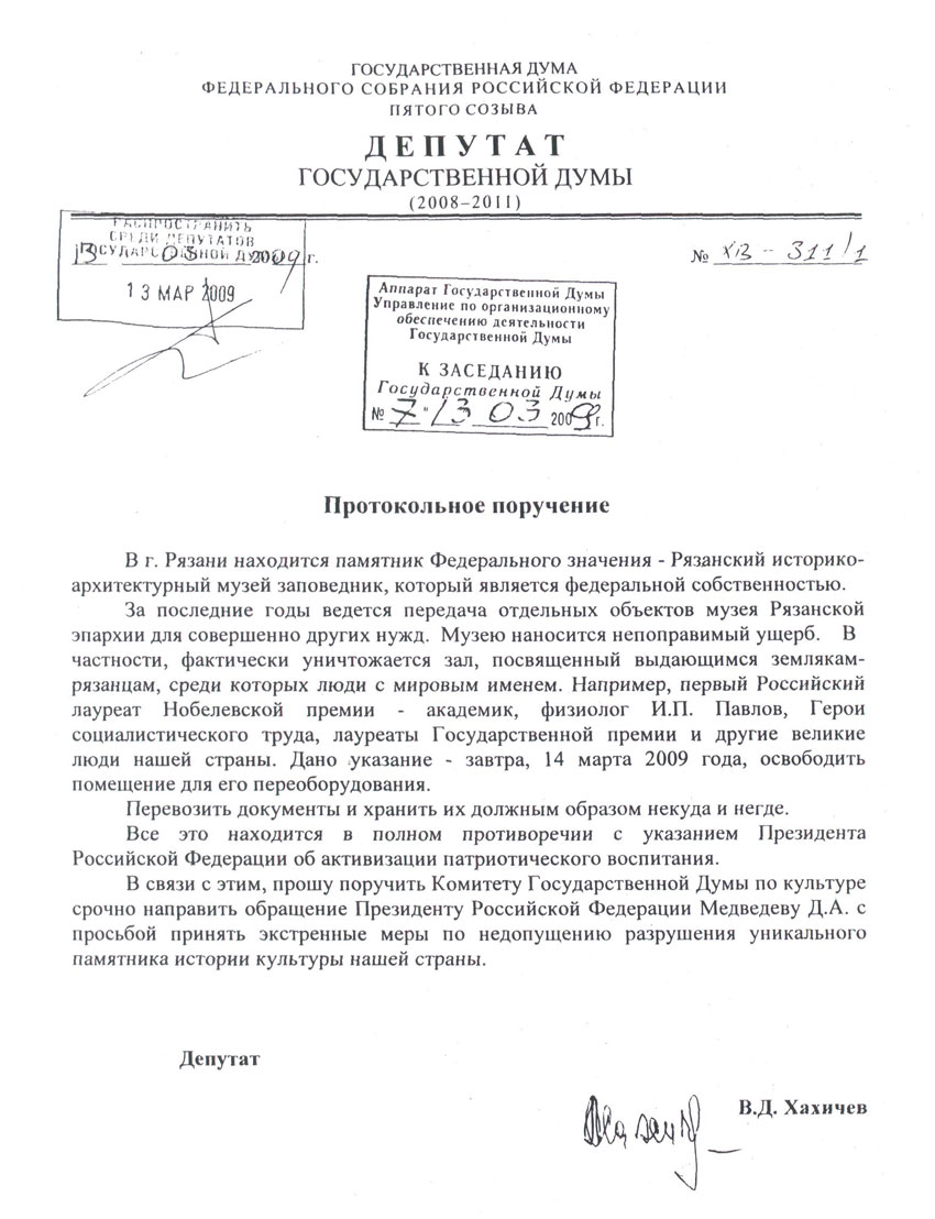 13 марта на пленарном заседании Госдумы депутат-коммунист В.Д. Хахичев заявил о необходимости сохранения памятника федерального значения – Рязанского историко-архитектурного музея-заповедника.