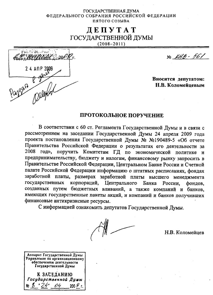 – На прошлом заседании в ответ на поручение Виктора Ивановича Илюхина здесь давали поручение раздать в зале сведения о заработной плате высшего менеджмента и о премиях, бонусах, полученных ими по итогам 2008 года.