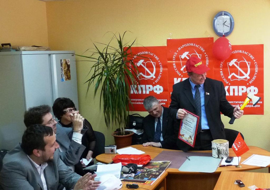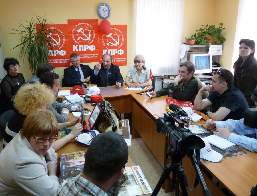 В небольшой комнате нового офиса обкома КПРФ теснота не помешала искреннему общению депутатов с представителями саратовских СМИ. Оставшись верными всем праздникам советского времени, коммунисты и на этот раз не изменили себе. Пресс-конференция началась с поздравления лучших журналистов Саратова с Днем советской печати, который до сих пор многие «акулы пера» отмечают 5 мая. Благодаря открытости, прямолинейности и общительности депутата областной думы Ольги Николаевны Алимовой, многие местные газеты и телеканалы, несмотря на негласный запрет, охотно рассказывают о лидерах саратовских коммунистов, их действиях, взглядах, мнениях, берут у них интервью… В качестве подарков журналисты и фотокорреспонденты получили настенные художественные перекидные календари «Передвижники», «130 лет со дня рождения И.В.Сталина», бейсболки и майки с надписью «СССР», а также шуточные призы, как победителям в различных шуточных номинациях: «думская изнанка», «знаток нравов», «выход в свет», «фокус» и т.д. Приз достался и депутату Госдумы Валерию Рашкину - в номинации «Правдолюб» он получил «нешуточные» березовое полено и топор с пожеланиями и в настоящем, и в будущем «рубить правду-матку». К этому и перешли в официальной части пресс-конференции.