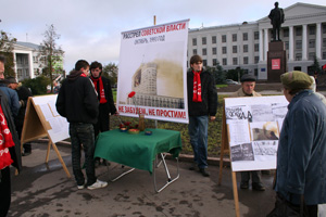 Митинг состоялся на центральной площади имени В.И. Ленина, которая была расцвечена красными знаменами, лозунгами и транспарантами. В центре площади, в месте массового движения псковичей, был выставлен баннер «Расстрел Советской власти – Не забудем! Не простим!» и информационные шиты с фотографиями погибших и их убийц. У баннера - столик с цветами, свечи и почетный караул из членов СКМ и КПРФ. Псковичи с интересом слушали песни сопротивления в исполнении Харчикова.