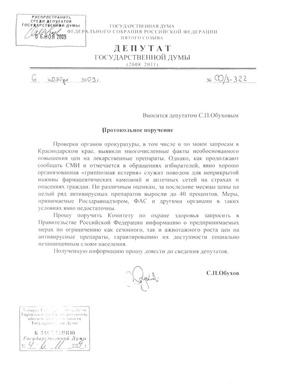 - Проверки органов прокуратуры, в том числе и по моим запросам в Краснодарском крае, выявили многочисленные факты необоснованного повышения цен на лекарственные препараты. Однако, как продолжают сообщать СМИ и отмечается в обращениях избирателей, явно хорошо организованная «гриппозная истерия» служит поводом для неприкрытой наживы фармацевтических кампаний и аптечных сетей на страхах и опасениях граждан. По различным оценкам, за последние месяцы цены на целый ряд антивирусных препаратов выросли до 40 процентов. Меры, принимаемые Росздравнадзором, ФАС и другими органами в таких условиях явно недостаточны.