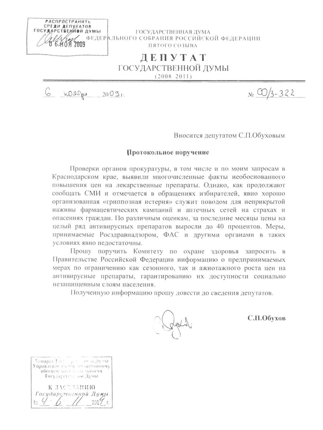 Прошу поручить Комитету по охране здоровья запросить в Правительстве Российской Федерации информацию о предпринимаемых мерах по ограничению как сезонного, так и ажиотажного роста цен на антивирусные препараты, гарантированию их доступности социально незащищенным слоям населения.