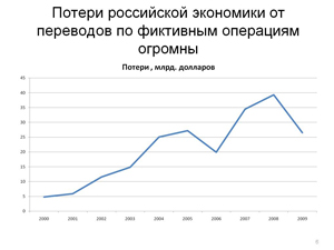 Другая серьезная проблема – отток капитала из страны, который за последнее десятилетие составил астрономическую величину. Согласно данным ЦБ за 10-летний период из страны было вывезено товаров на сумму на 850 млрд. долларов большую, чем было импортировано. При этом валютные резервы страны на конец 2009 года уступали по величине суммарному внешнему долгу государства и бизнеса. То есть, несмотря на ежегодный вывоз огромного объема природных богатств из России, накопить стране за это период ничего не удалось. Большая часть потерь пришлась на отток капитала, который по самым скромным оценкам превысил 500 млрд. долларов. Олигархи, преступные группы, высший менеджмент крупнейших компаний выводили из страны деньги, полученные за счет продажи невозобновляемых природных ресурсов России. Потери страны только за счет переводов по фиктивным операциям с ценными бумагами, а также неполученной экспортной выручки превысили 200 млрд. долларов (слайд 6).