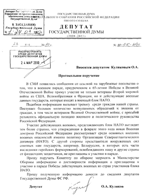 Прошу поручить Комитету по обороне запросить в Министерстве Обороны информацию о достоверности информации о приглашении к участию в параде Победы действующих военных из стран-участников блока НАТО.