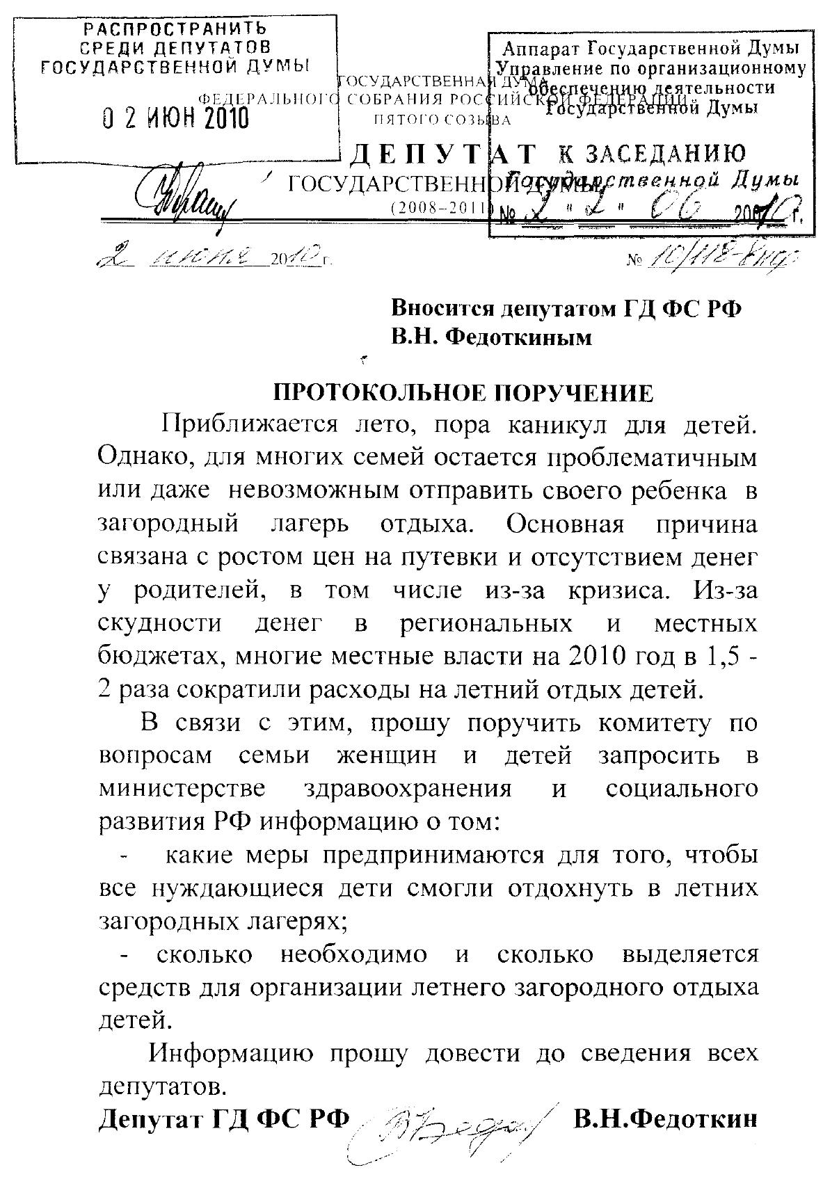 В связи с этим, прошу поручить комитету по вопросам семьи женщин и детей запросить в министерстве здравоохранения и социального развития РФ информацию о том, какие меры предпринимаются для того, чтобы все нуждающиеся дети смогли отдохнуть в летних загородных лагерях;