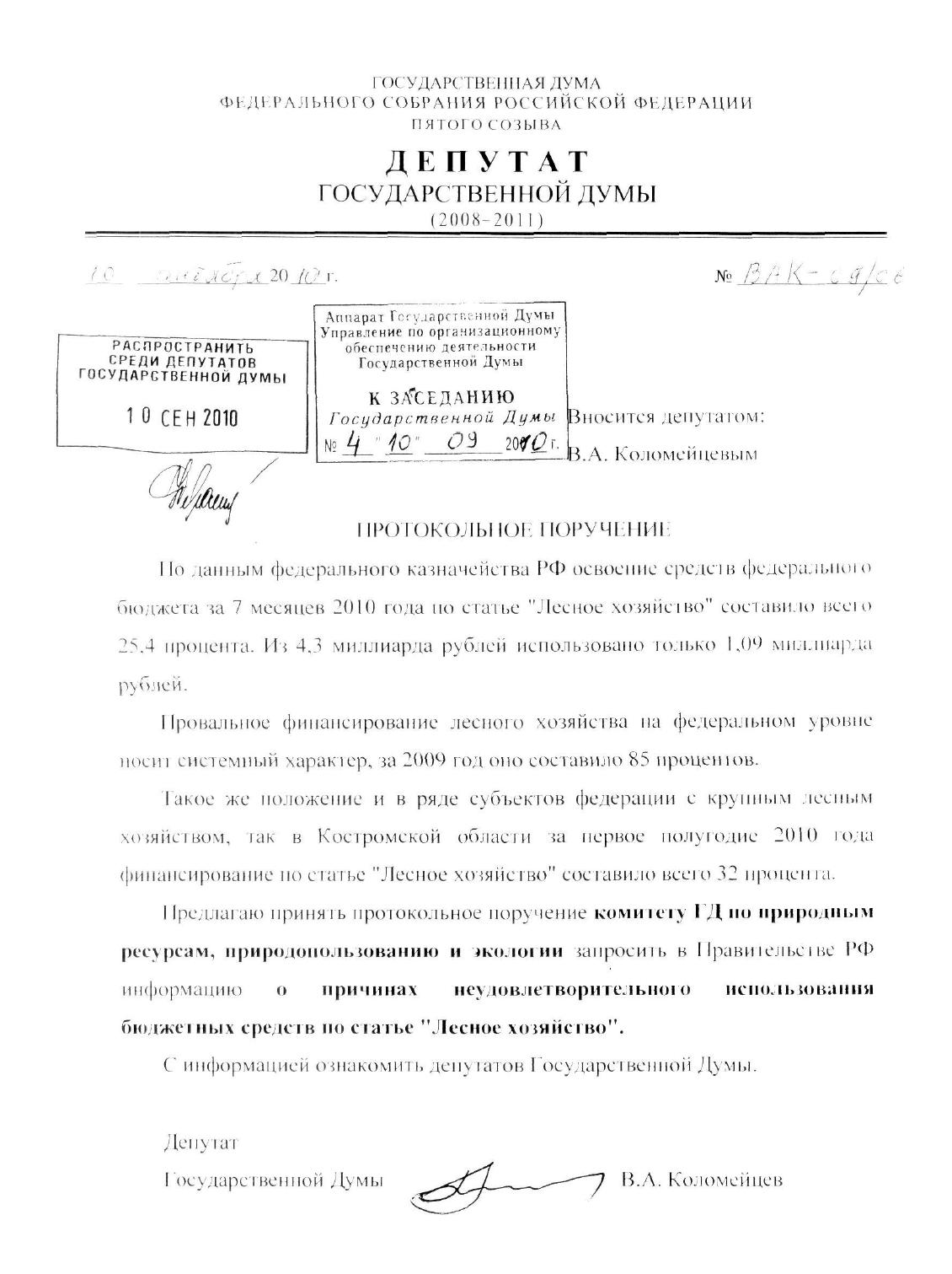 Предлагаю принять протокольное поручение комитету ГД но природным ресурсам, природопользованию и экологии запросить в Правительстве РФ информацию о причинах неудовлетворительною использования бюджетных средств по статье "Лесное хозяйство".