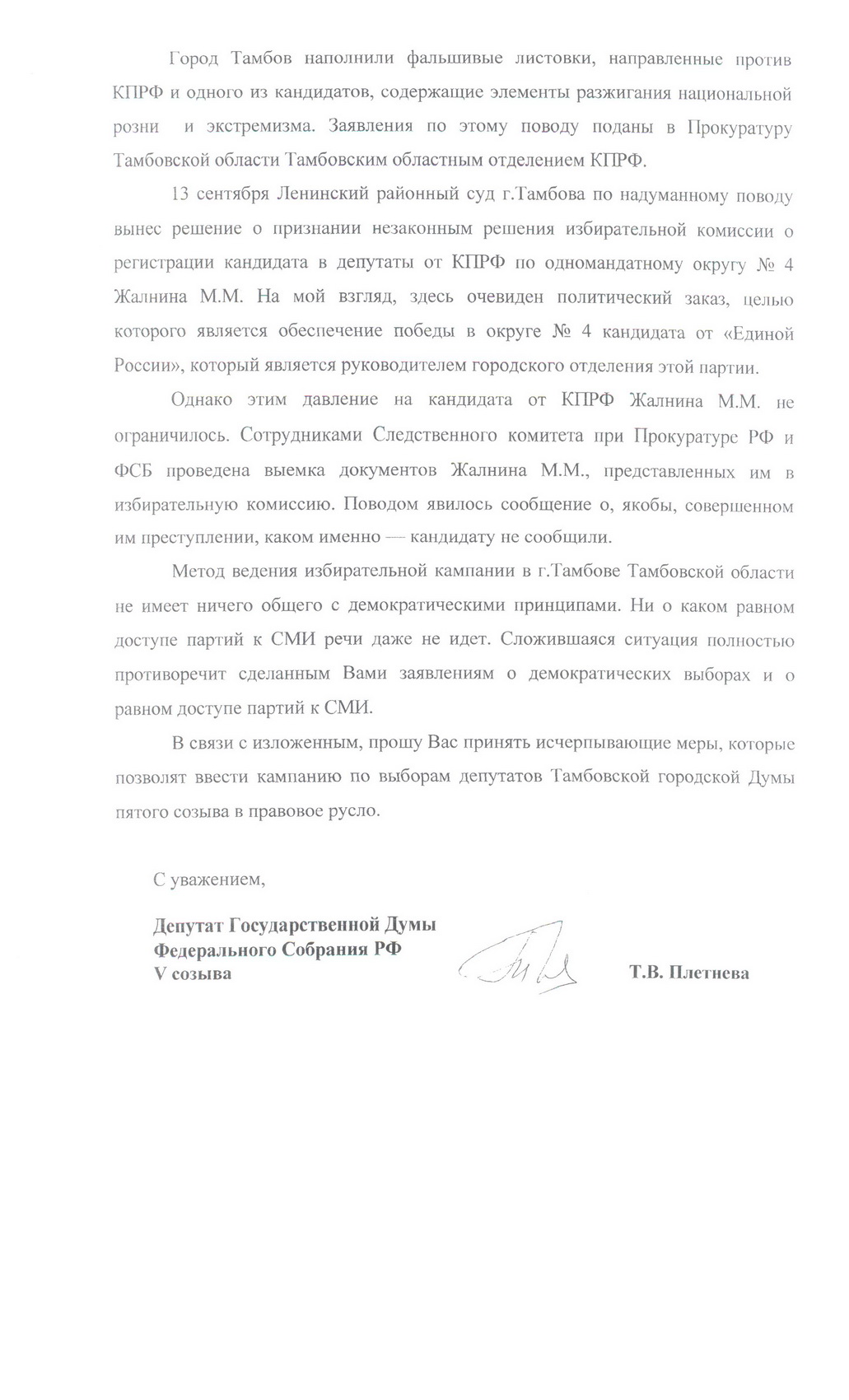 Депутат фракции КПРФ в Госдуме Т.В. Плетнева направила письмо Президенту РФ Д.А. Медведеву в связи ситуацией, сложившейся в период избирательной кампании в г.Тамбове Тамбовской области.