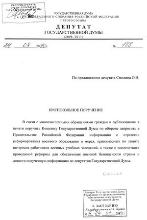 Депутат фракции КПРФ О.Н. Смолин внес на заседании Госдумы протокольное поручение, которое было отклонено «медвежьим» большинством.