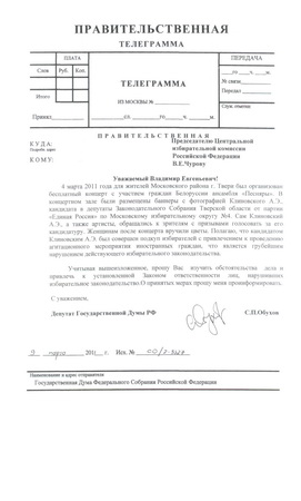 4 марта 2011 года для жителей Московского района г. Твери был организован бесплатный концерт с участием граждан Белоруссии ансамбля «Песняры». В концертном зале были размещены баннеры с фотографией Клиновского А.Э., кандидата в депутаты Законодательного Собрания Тверской области от партии «Единая Россия» по Московскому избирательному округу №4. Сам Клиновский А.Э., а также артисты, обращались к зрителям с призывами голосовать за его кандидатуру. Женщинам после концерта вручили цветы. Полагаю, что кандидатом Клиновским А.Э. был совершен подкуп избирателей с привлечением к проведению агитационного мероприятия иностранных граждан, что является грубейшим нарушением действующего избирательного законодательства.
